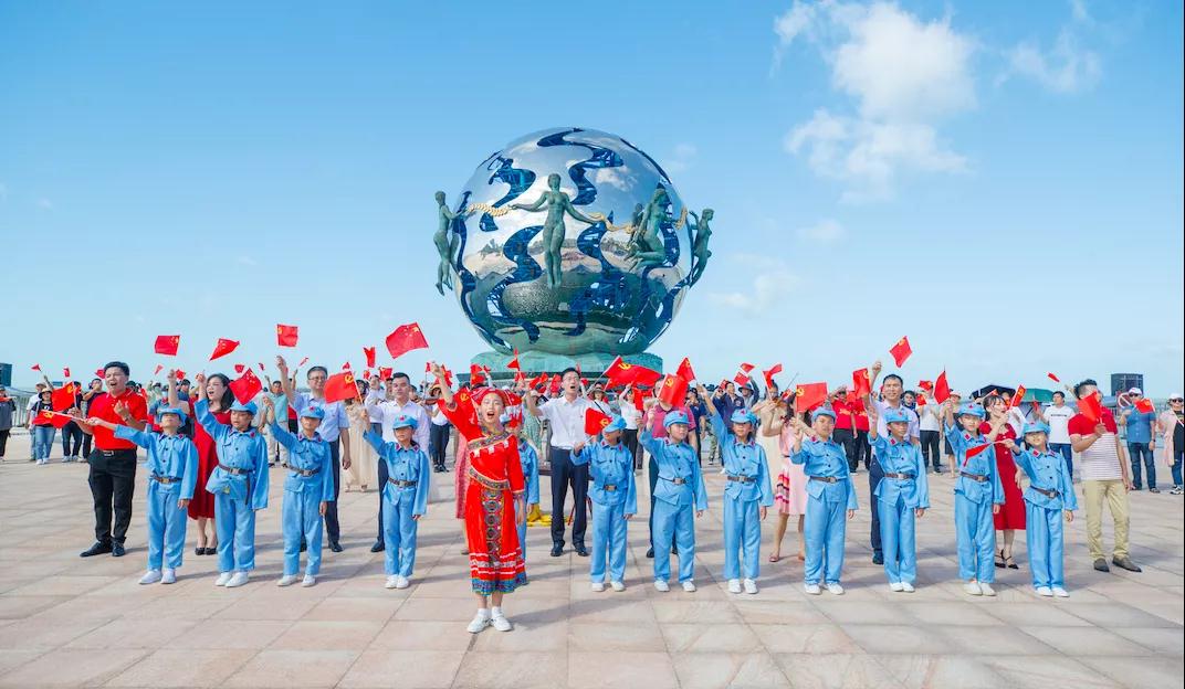 “五星紅旗迎風(fēng)飄揚(yáng),勝利歌聲多么響亮,歌唱我們親愛(ài)的祖國(guó),從今走向繁榮富強(qiáng)……”6月18日上午9時(shí)許,一聲清脆的童聲清唱在銀灘潮雕廣場(chǎng)響起,吸引了現(xiàn)場(chǎng)游客及市民的關(guān)注。由市國(guó)資委黨委、北海銀灘度假區(qū)黨工委、北海旅游集團(tuán)有限公司黨委發(fā)起,游客自發(fā)參與的“感黨恩·跟黨走”2021建黨百年紅歌快閃活動(dòng)在潮雕廣場(chǎng)閃亮登場(chǎng)。藍(lán)天碧海,海風(fēng)習(xí)習(xí)。銀灘潮雕廣場(chǎng)內(nèi),《唱支山歌給黨聽(tīng)》的古箏前奏徐徐響起,4名小提琴手也從四面演奏歌曲前奏,慢慢匯聚到廣場(chǎng)中央;兩名男主唱和兩名女主唱陸續(xù)從四個(gè)方向唱著歌曲進(jìn)入廣場(chǎng)中央深情演唱……游客們紛紛停下腳步,跟著音樂(lè)哼唱,漸漸地人越圍越多,歌聲越唱越響。大家揮動(dòng)著手中的國(guó)旗、黨旗,齊唱《唱支山歌給黨聽(tīng)》,抒發(fā)對(duì)祖國(guó)的熱愛(ài),不少游客甚至熱淚盈眶。一位女游客激動(dòng)地說(shuō):“這個(gè)氣氛超燃!感謝主辦方舉辦的活動(dòng),把大家的情緒都調(diào)動(dòng)起來(lái)了,大家的心凝聚在了一起,自豪感油然而生!”