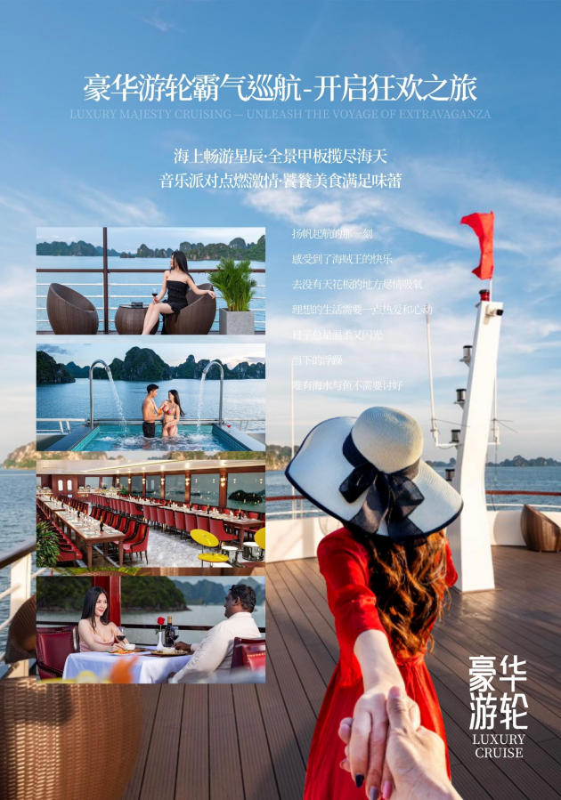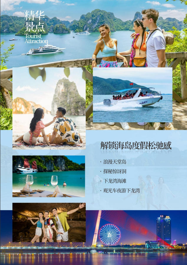 早餐后乘坐【diamond cruises號(hào)或dream cruises 或phoenix vip cruise或同級(jí)別】,暢游海上桂林—下龍灣。一邊聆聽(tīng)抒情的音樂(lè),邊觀賞下龍灣的美景,享用約100 種高級(jí)菜肴,(含自助午餐+自助下午茶)。漫游世界八大自然遺產(chǎn)之一的“海上桂林”, —下龍灣(游覽時(shí)間約6H)(在1500多平方公里的海面上、聳立著3600多座大小不一、千姿百態(tài)的喀斯特地貌的山石、更以其“海美、山幽、洞奇”三絕而享譽(yù)天下)登海上島嶼——溶洞,觀狗爬山、香爐山、斗雞山等數(shù)不勝數(shù)的風(fēng)景盡收眼底,再?gòu)亩冯u石出發(fā)游覽下龍灣的精華景點(diǎn)之一(迷宮仙境),隨著游船觀賞一座座的獨(dú)立仙巖(大拇指山、青蛙山、天鵝山)等千姿百態(tài)的景色。,午餐安排于船上進(jìn)行品海鮮餐,下龍灣亦有小漁船如影相隨,把酒臨風(fēng),去國(guó)懷鄉(xiāng)之憂蕩然無(wú)存,在天海一色中的游船上大快朵頤的美妙感覺(jué)在您的全身悄悄蔓延。午餐后乘坐【快艇】前往【月亮湖】,抵達(dá)洞口后換成小木船進(jìn)入洞內(nèi),月亮湖是一個(gè)360度皆為垂直絕壁的封閉海灣,空靈幽閉。湖水清澈見(jiàn)底,水平如鏡,從上面俯瞰圓如滿月,所以稱為月亮湖。游完后乘坐快艇前往越南最浪漫、最漂亮的島嶼—【天堂島】,島上活動(dòng)1-2小時(shí)。細(xì)白的沙灘上可以玩各種沙灘游戲(游戲道具自備),在指定區(qū)域還可以游泳,登上島嶼的山頂俯視下龍灣海上桂林全景,拍攝您心意的美照,隨后坐船返回碼頭下船,后下船,告別上帝賜于越南最好的禮物---下龍灣。
