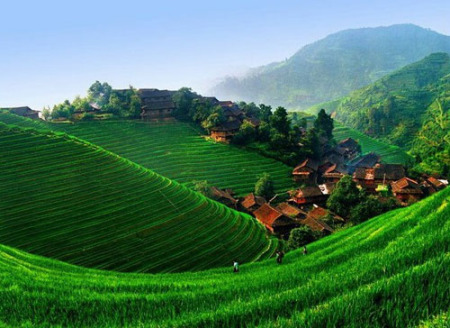 龍勝縣東南部和平鄉(xiāng)境內(nèi),有一個(gè)規(guī)模宏大的梯田群,如鏈似帶,從山腳盤繞到山頂,小山如螺,大山似塔,層層疊疊,高低錯(cuò)落。其線條行云流水,瀟灑柔暢;其規(guī)模磅礴壯觀,氣勢(shì)恢弘,有“梯田世界之冠”的美譽(yù),這就是龍脊梯田。