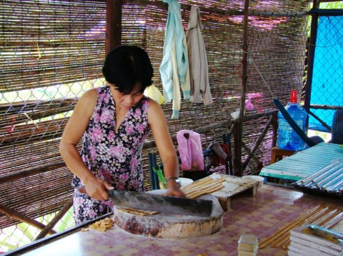 越南民風(fēng)的厚道被表現(xiàn)得淋漓盡致。上了水果島,更像是到了水果加工廠(chǎng)。因?yàn)閸u上長(zhǎng)著火龍果、紅毛丹、椰子、柚子、香蕉等水果,隔不遠(yuǎn)就是一個(gè)小加工廠(chǎng),向游客全面展示水果糖、椰木雕等的制作過(guò)程,水果大餐當(dāng)然更是必不可少的一道程序。