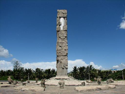 亞龍灣中心廣場,位于三亞市東南28公里處。騰柱向藍天升騰,以雕塑群向大地和大海延伸,其宏偉氣勢和獨特的藝術造型,以有限的藝術空間形式,引導我們的想象向無限的空間擴展。屹立的圖騰柱是廣場的最高點,高26.8米,由200多塊巨大的花崗石和直徑2.5米的鋁合金柱組成。上面雕刻有龍、鳳、太陽鳥、魚以及風雨雷電四神的圖案。 圍繞圖騰柱的中心雕塑區(qū),形成三圈石硨,氣勢宏大、形象獨特:第一圈有蒼龍、白虎、朱雀、玄武四季標識與日晷24節(jié)氣雕塑;第二圈表現(xiàn)盤古開天地、女媧補天、嫦娥奔月、弄天舞干戚、大禹治水、牛郎織女、后羿射日、夸父追日等八個遠古神話;第三圈反映天文、人、動物、植物萬物生靈及八位中國古代之神。圖騰柱和雕塑群渾然一體,構成強烈的中國古天文意識和東方神秘色彩。廣場外圍設計的五組白色風帆式的尖頂帳篷及大型彩色噴泉,給具有古老文化意蘊的雕塑增添了現(xiàn)代氣息。