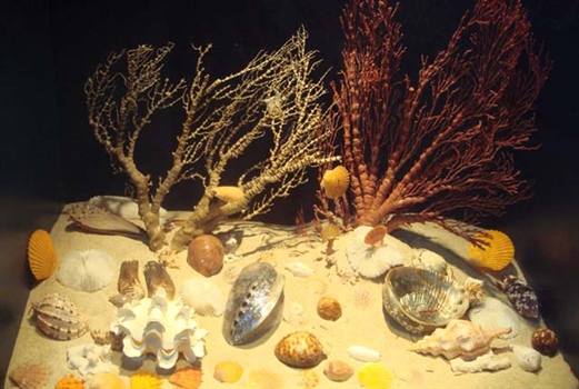 走進(jìn)貝殼展廳,仿佛走進(jìn)夢(mèng)幻般的海底世界。曲徑通幽的貝殼展廳以藍(lán)色為設(shè)計(jì)主調(diào),四壁墻面除陳列貝殼展品用的櫥窗外均漫畫式的畫滿各種海藻、水草和海洋生物。地面墻角用鵝卵石和沙子堆積,然后用珊瑚、貝殼、海星、海龜?shù)葮?biāo)本點(diǎn)綴,營(yíng)造出一種神奇的海底景觀。展覽廳里,分別展示大西洋、印度洋、太平洋和中國(guó)南海的千姿百態(tài)、色彩斑斕的貝殼達(dá)300多種。