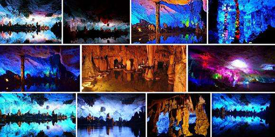 洞內(nèi):洞內(nèi)天然形成密集的鐘乳石,它們的線條豐富流暢,有雄偉廣闊之勢(shì)。加以燈光陪襯。創(chuàng)造出各種意境,使羅列疏密有致的石柱、石筍、石鐘乳、石旗、石幔成為一件件藝術(shù)品,給人豐富多彩的想象空間和藝術(shù)享受,整個(gè)巖洞恰似一座大自然的藝術(shù)之宮。在蘆笛巖洞內(nèi)不僅能感受到大自然鬼斧神工造就的形態(tài)美,同時(shí),還能感受到園林工作者賦予它的色彩美和意境美,仿佛置身于一座藝術(shù)殿堂。
